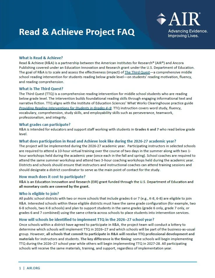 Read & Achieve (R&A) is a collaboration between the American Institutes for Research® (AIR®) and Ancora Publishing. The goal is to scale and evaluate the impact of The Third Quest (TTQ)—a comprehensive middle school reading intervention for students reading below grade level—on students’ reading motivation, fluency, and comprehension skills.